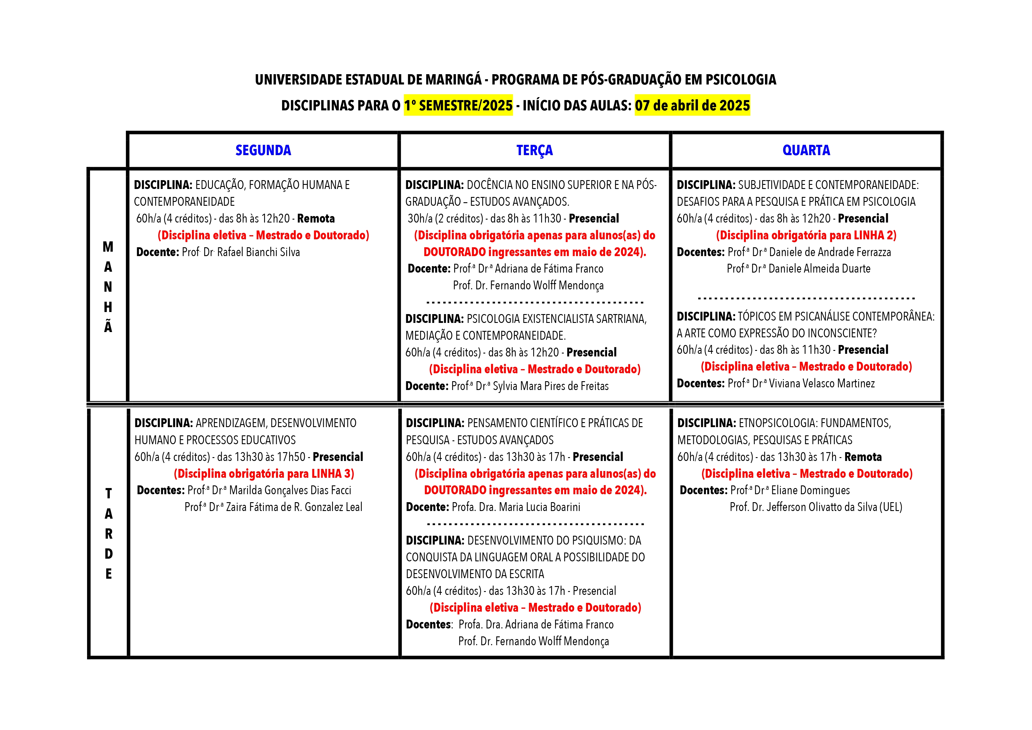 Disciplinas 2/2025 - Horário de aulas (pdf) (Clique aqui)