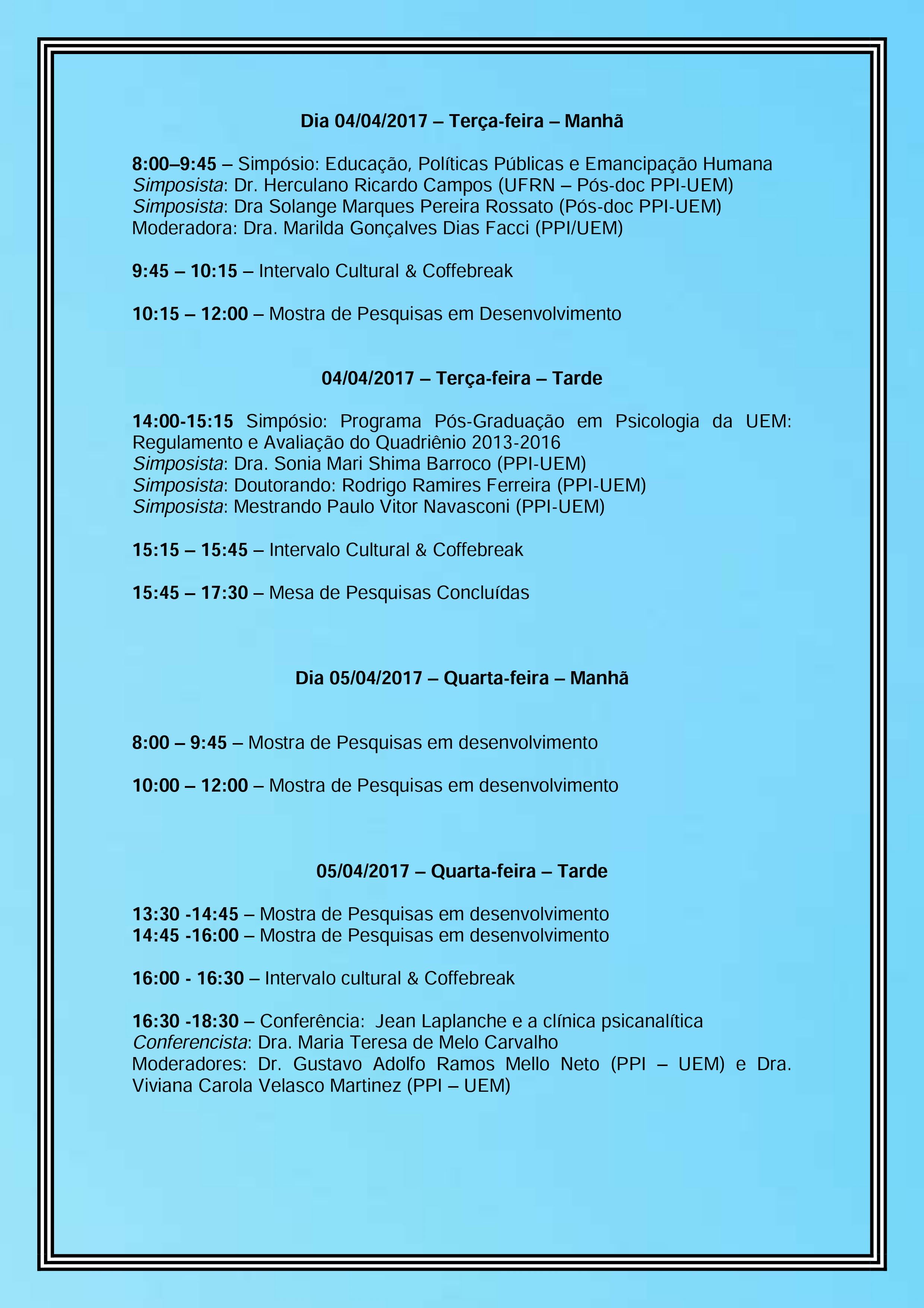 Programação apresentação pesq